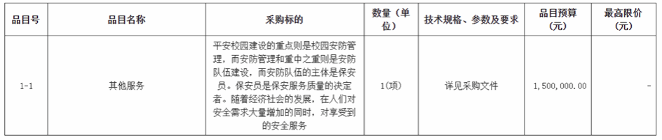 1-1 其他服务 平安校园建设的重点则是校园安防管理,而安防管理和重中之重则是安防队伍建设,而安防队伍的主体是保安员。保安员是保安服务质量的决定者。随着经济社会的发展,在人们对安全需求大量增加的同时,对享受到的安全服务 1(项) 详见采购文件 1,500,000.00 -